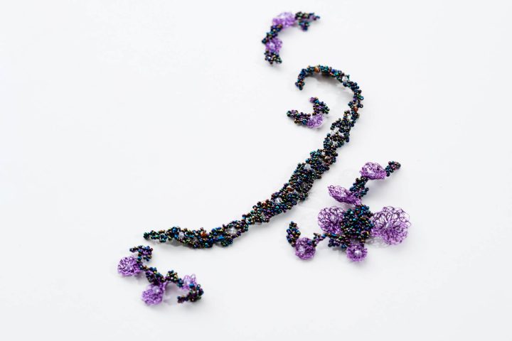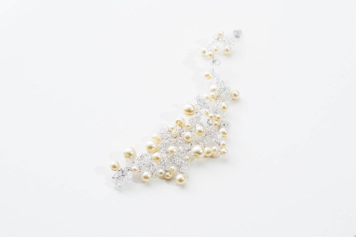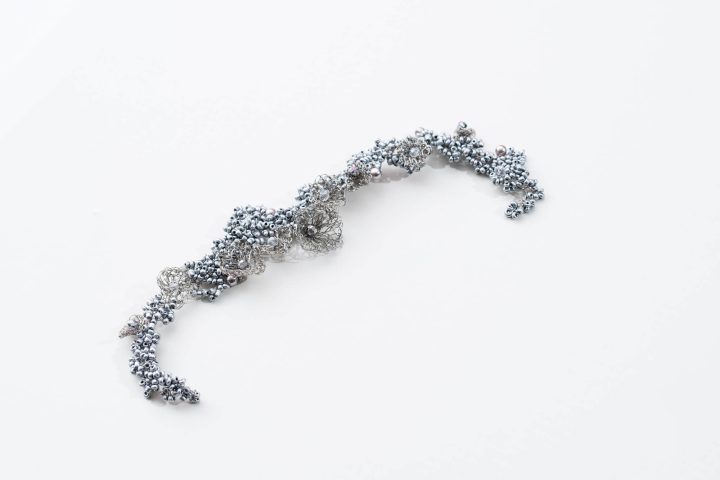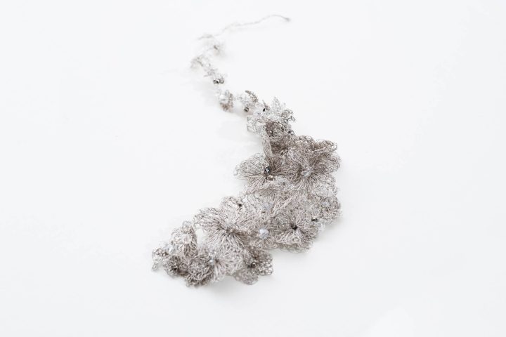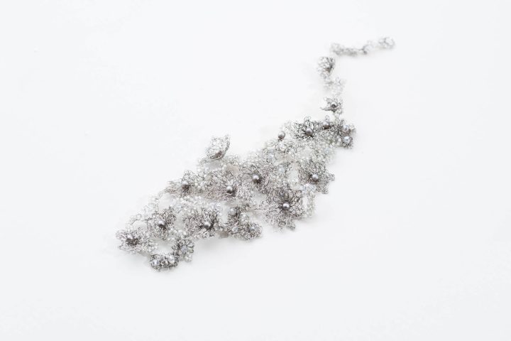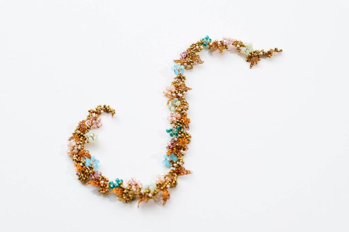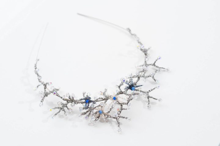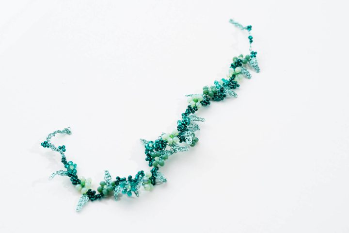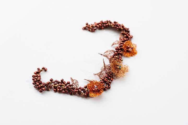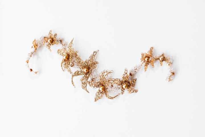 Flores de cobre esmaltado tejido en color dorado viejo y cristales transparentes. La forma es flexible para adaptarse al peinado. Añadiendo un cierre es un precioso collar.