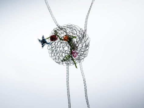 Un colgante de acero, regulable en altura y que se puede utilizar de broche independiente.