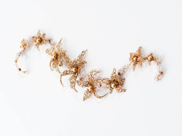 Flores de cobre esmaltado tejido en color dorado viejo y cristales transparentes.
