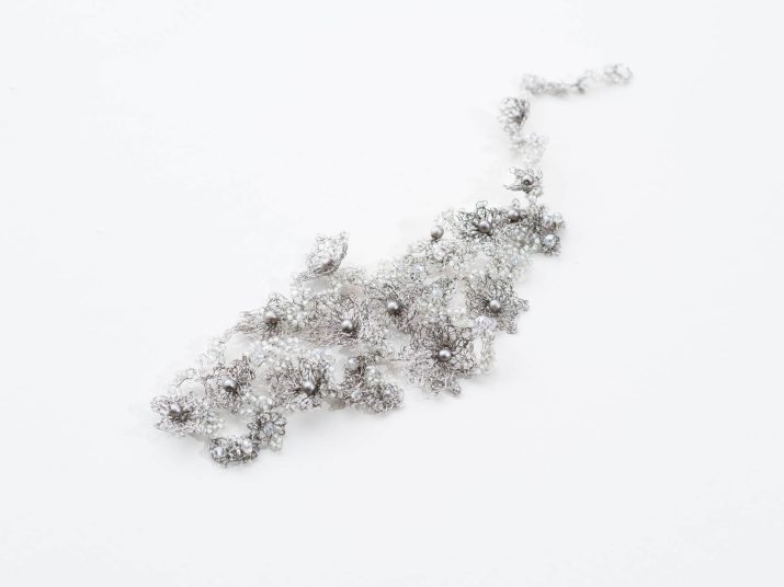 Cristales blancos y flores plateadas. Todo tejido con acero inoxidable.